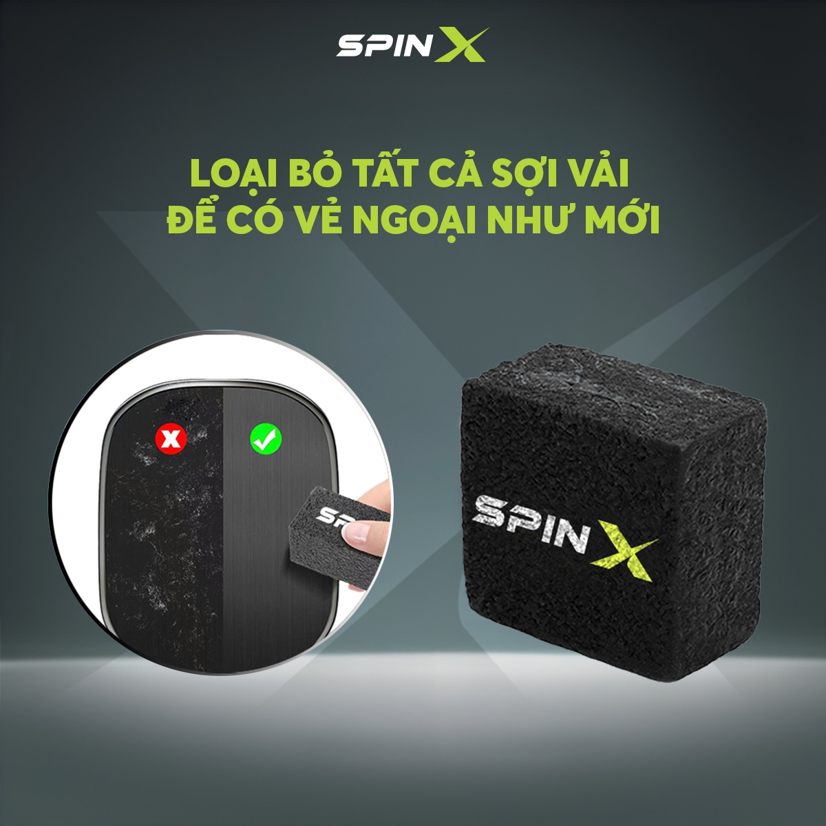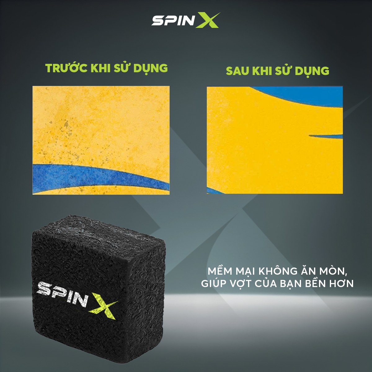 Làm sạch nhanh – không cần nước: Chỉ cần chà nhẹ, gôm SpinX loại bỏ tức thì bụi, dầu, cặn bẩn bám lâu ngày trên mặt vợt.